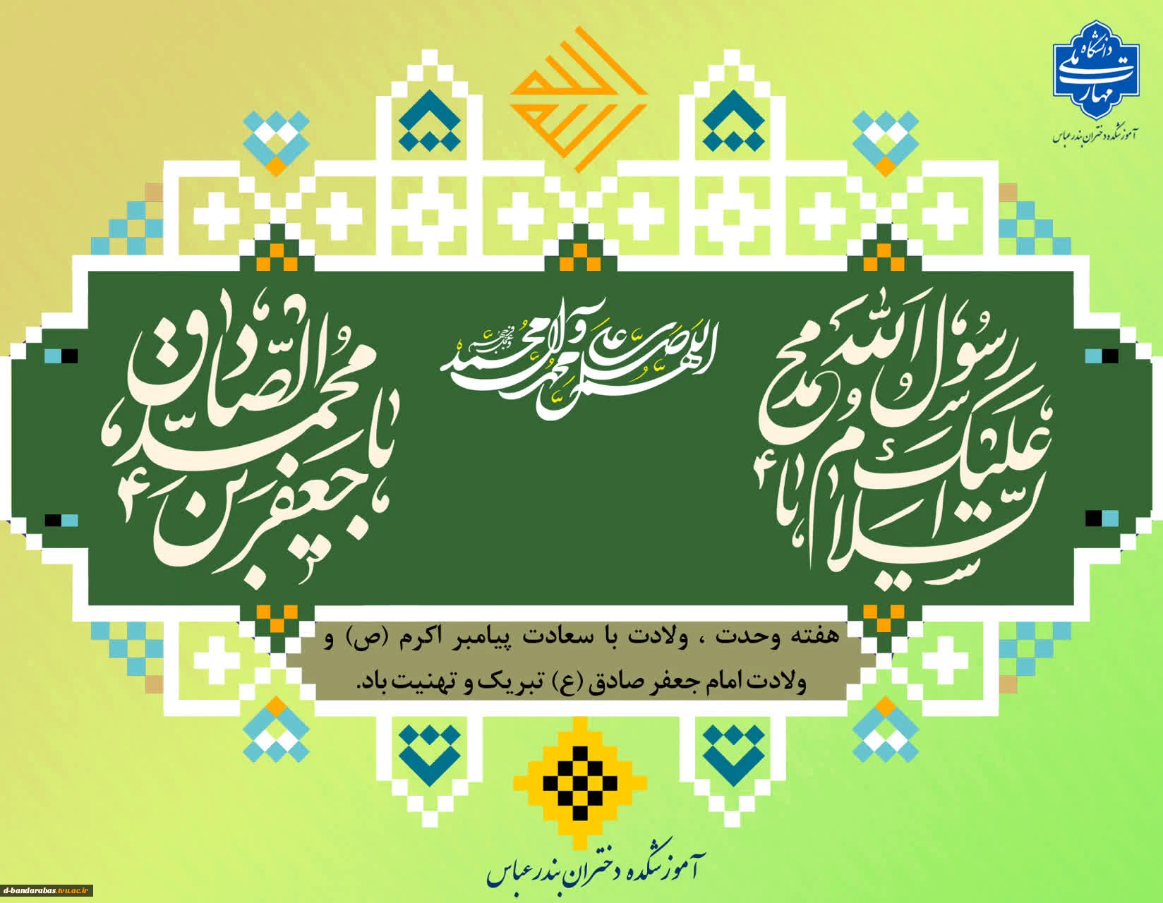 امتیاز دهید : هفته وحدت ، ولادت با سعادت پیامبر اکرم (ص) و ولادت امام جعفر صادق (ع) تبریک و تهنیت باد. چهارشنبه 2 مهر 1404 ساعت 9:17